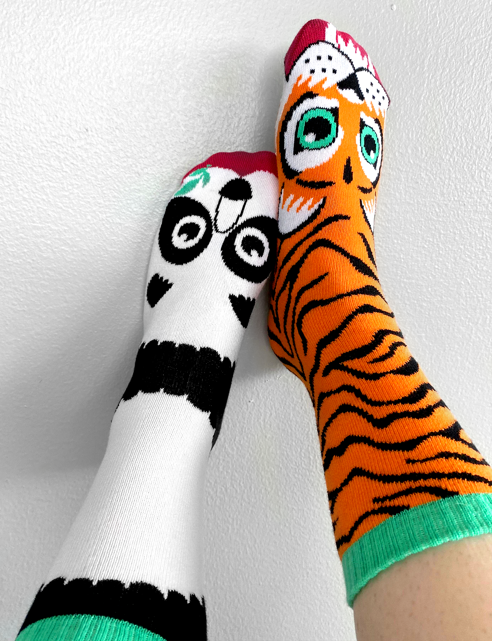 You'll go WILD for these bright mismatched socks FEETuring your favorite asiatic jungle animals - a Tiger and Panda! These socks are from the Pals Originals Collection.