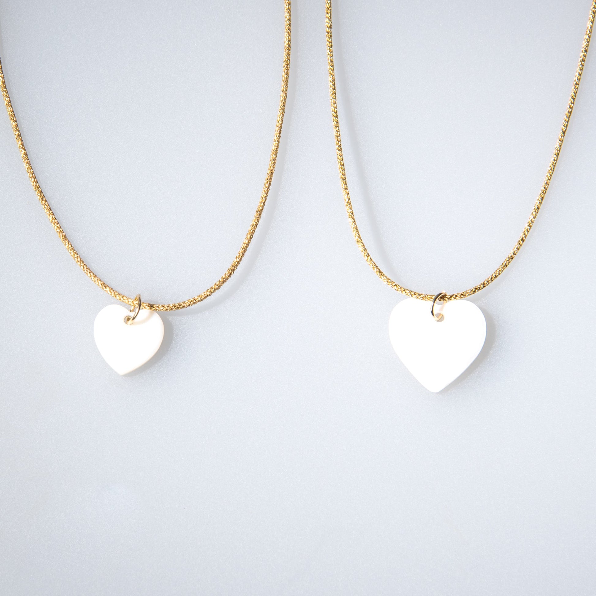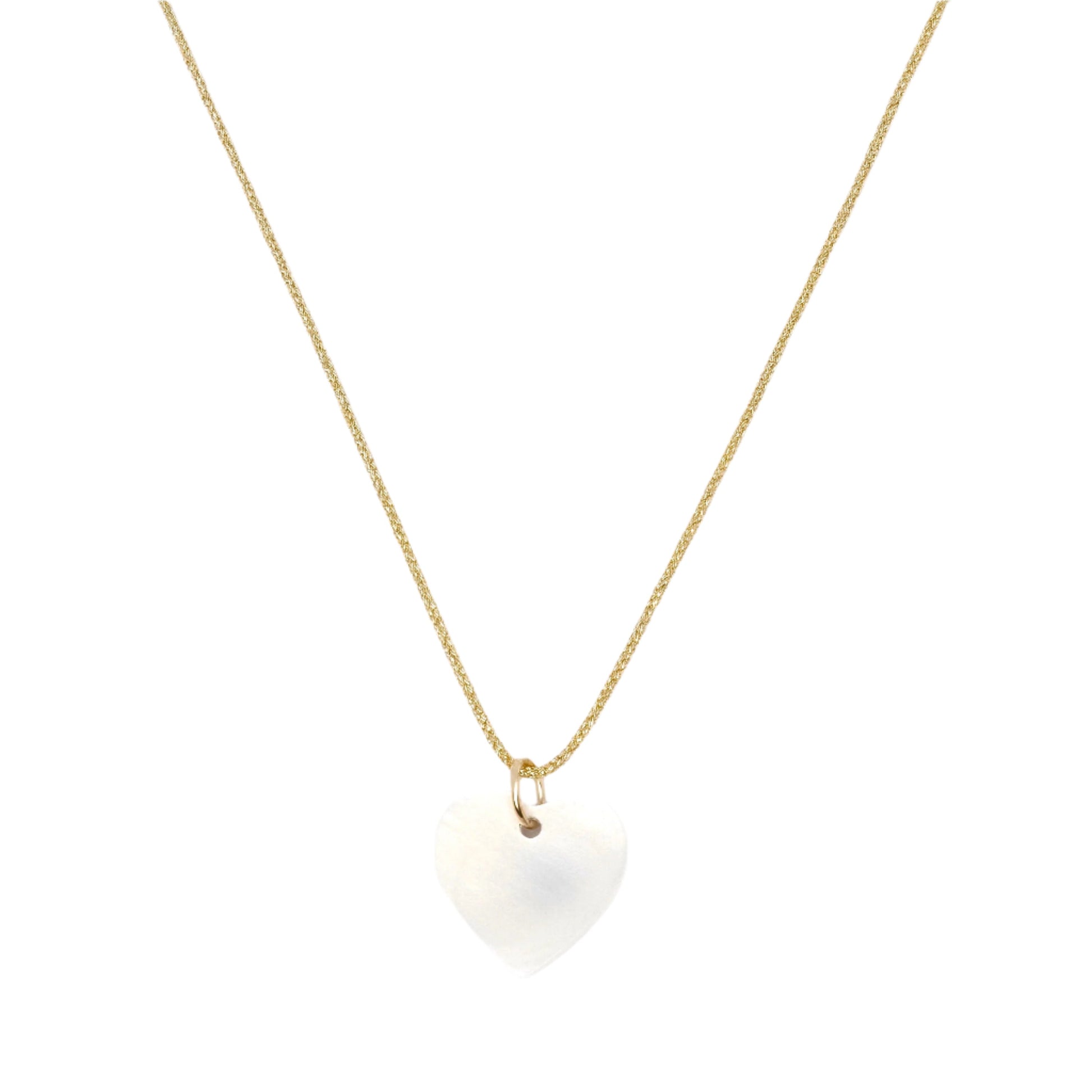 A heart-shaped mother of pearl pendant attached to a silver or gold-threaded necklace.